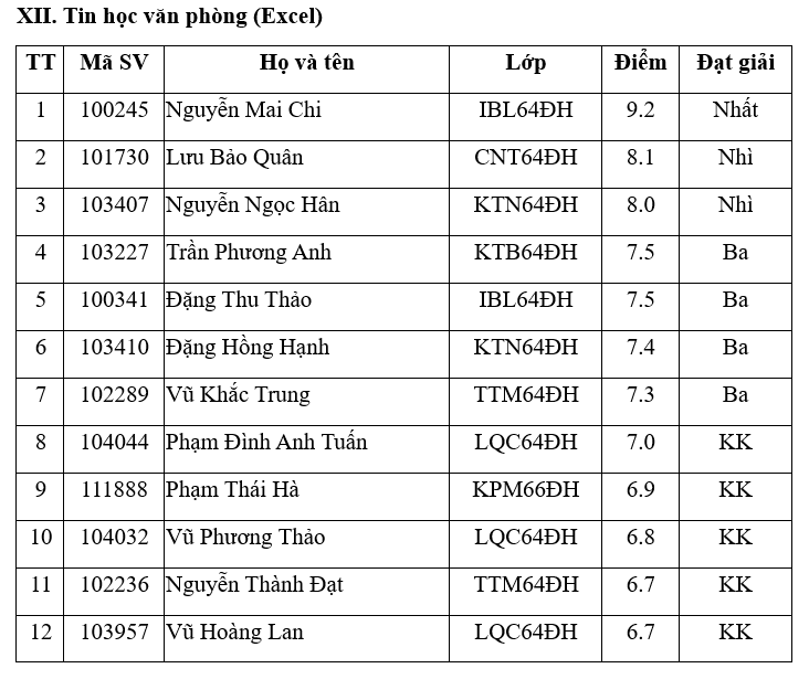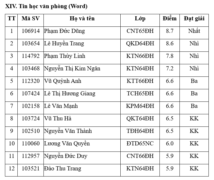 Môn Word: Bạn Vũ Quỳnh Anh (KTT66ĐH), Bạn Lê Thị Hương Giang (TCH65ĐH), Bạn Lê Văn Mạnh (KPM64ĐH).