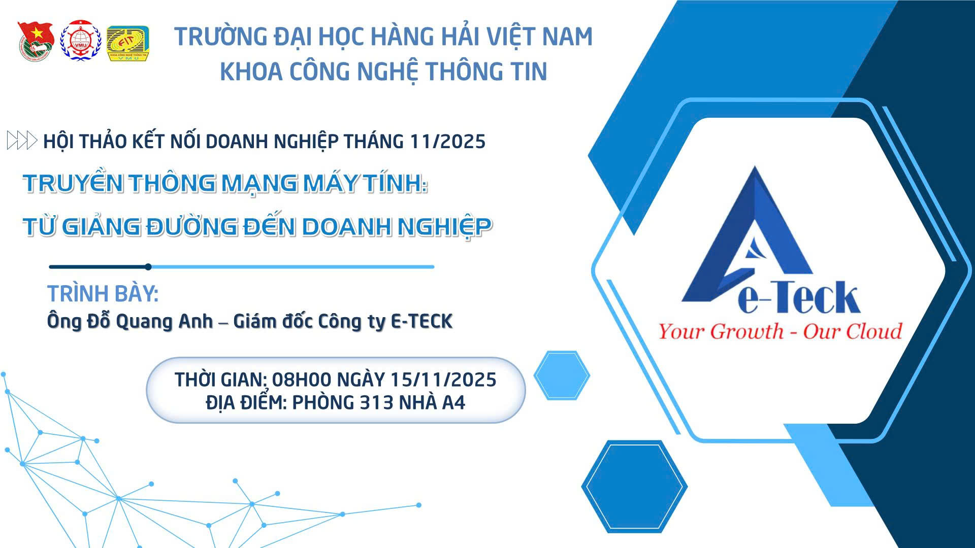 Sáng ngày 15/11/2025, Khoa Công nghệ thông tin – Trường Đại học Hàng hải Việt Nam đã tổ chức **Hội thảo Kết nối Doanh nghiệp** với sự tham dự của Ông Đỗ Quang Anh - GĐ Công ty E-teck. cùng đội ngũ cán bộ, giảng viên và sinh viên của khoa. Hoạt động nằm trong chuỗi sự kiện thiết thực hướng tới kỷ niệm **Ngày Nhà giáo Việt Nam 20/11**.