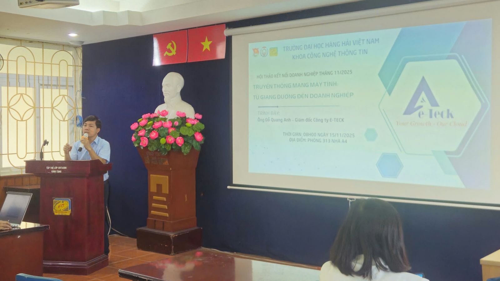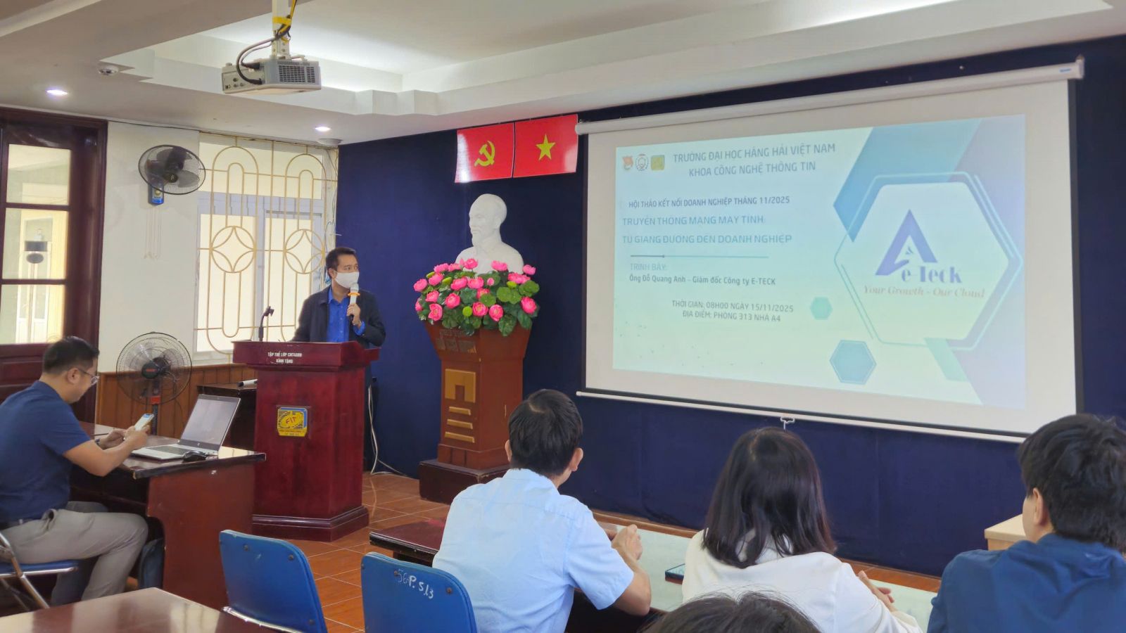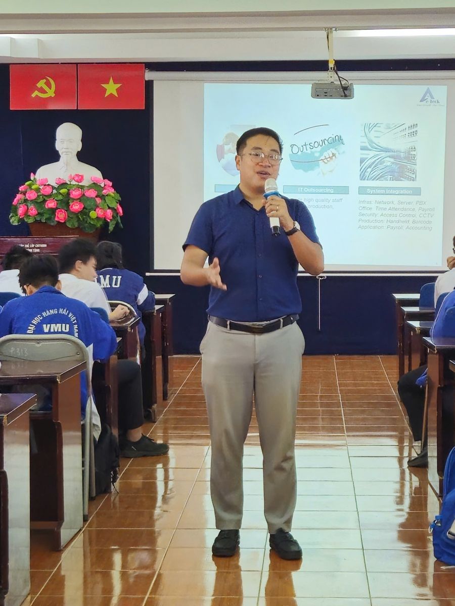 Ngày 15/11/ 2025, tại phòng 313 A4, Khoa CNTT – Trường Đại học Hàng hải Việt Nam đã tổ chức Hội thảo Kết nối Doanh nghiệp với chủ đề "Truyền thông mạng máy tính từ giảng đường đến doanh nghiệp"