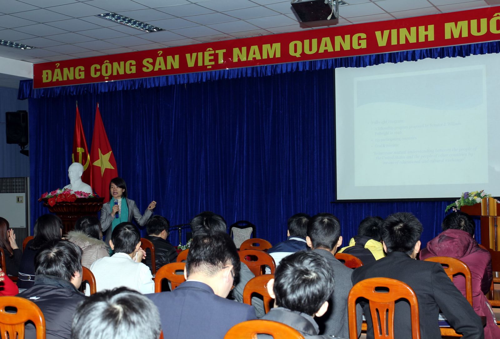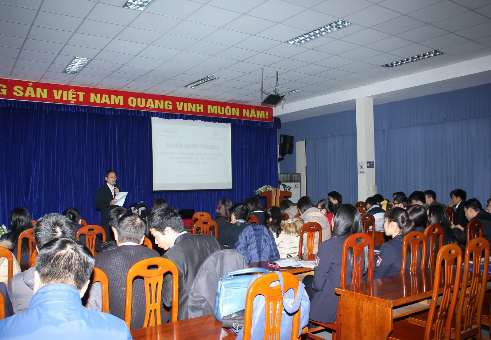 Trong khuôn khổ hợp tác với Chương trình Fulbright tại Việt Nam – Đại sứ quán Hoa Kỳ, Nhà trường đã tổ chức Buổi giới thiệu về Chương trình Học bổng Fulbright lấy bằng Thạc sỹ tại Hoa Kỳ năm học 2016 -2017 cùng với các Học bổng mà Đại sứ quán Mỹ đang triển khai tại Việt Nam (Chương trình Học giả Tiếng Anh, Học bổng Huburt Humphrey, Học bổng US-ASEAN,…) vào hồi 14h00 ngày 08/01/2015.