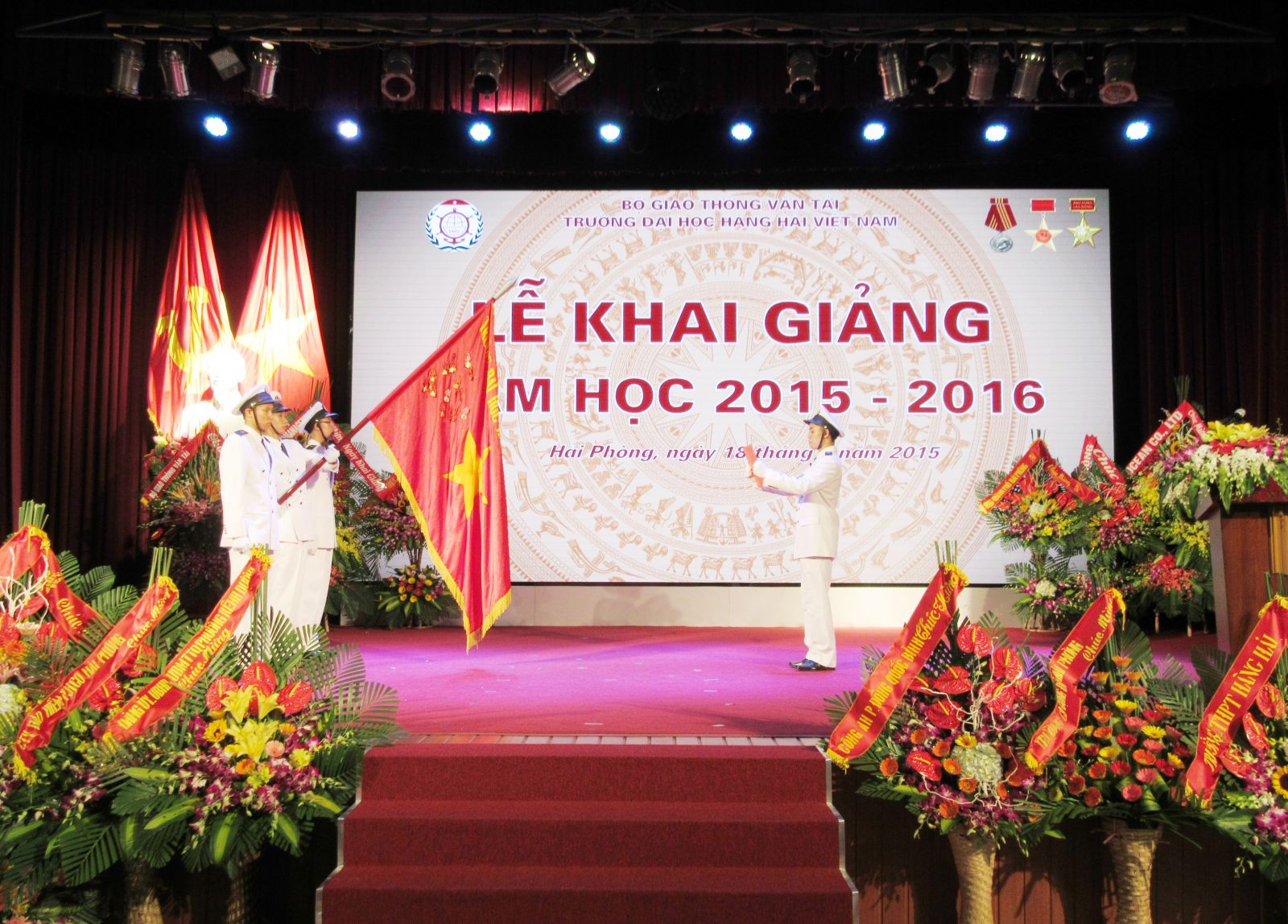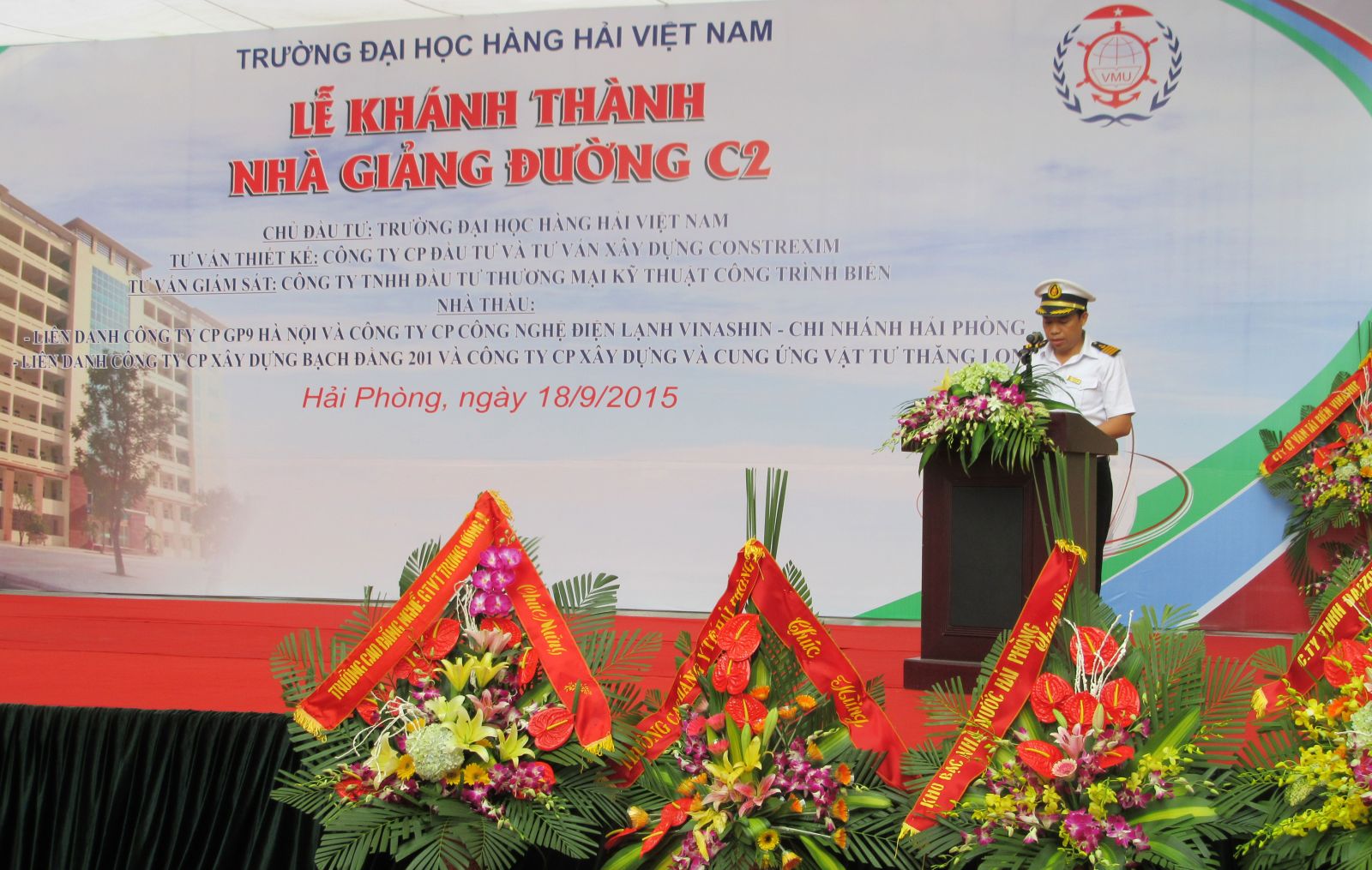 Hòa chung trong không khí tưng bừng phấn khởi của đất nước ta, dân tộc ta với những phút giây hào hùng của mùa thu lịch sử, kỉ niệm trọng thể những ngày lễ lớn: 70 năm ngày cách mạng tháng 8 thành công và quốc khánh 2/9, 70 năm ngày truyền thống ngành Giao thông vận tải, thực hiện sự chỉ đạo của Bộ Giao thông vận tải, được sự nhất trí của các cấp các ngành, 09h00 ngày 18/9/2015 tại hội trường A8, Trường Đại học Hàng hải Việt Nam đã long trọng tổ chức Lễ Khai giảng năm học 2015-2016, đồng thời cắt băng khánh thành, gắn biển Nhà Giảng đường C2.