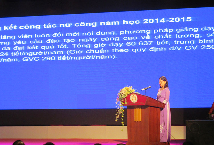 Tại buổi lễ, Th.S Đặng Khánh Ngọc- Phó Chủ tịch Công đoàn, Trưởng ban nữ công Trường đã báo cáo thành tích công tác nữ và phong trào “Giỏi việc nước, đảm việc nhà” năm học 2014-2015; phương hướng hoạt động trong năm học 2015-2016. Toàn thể nữ CB, GV, CNV Trường Đại học Hàng hải phát huy truyền thống phụ nữ Việt Nam “Anh hùng, bất khuất, trung hậu, đảm đang”, các phong trào thi đua “Phụ nữ tích cực học tập, lao động sáng tạo, xây dựng gia đình hạnh phúc”. Để đáp ứng yêu cầu đào tạo sinh viên theo hệ thống tín chỉ, đội ngũ nữ giáo chức Nhà trường đã luôn cải tiến phương pháp giảng dạy để đạt kết quả tốt trong các kỳ thi.