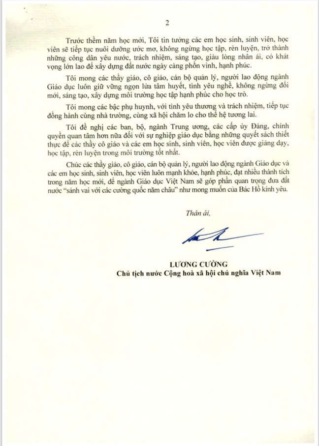 Dưới đây là thư gửi ngành Giáo dục của Chủ tịch nước Lương Cường nhân dịp khai giảng năm học mới 2025-2026:
