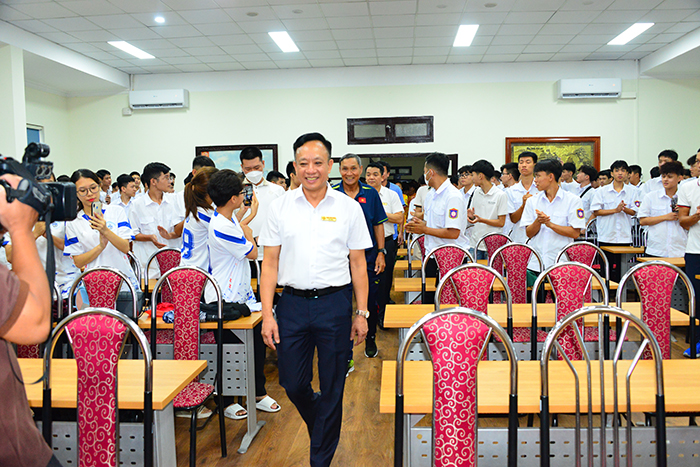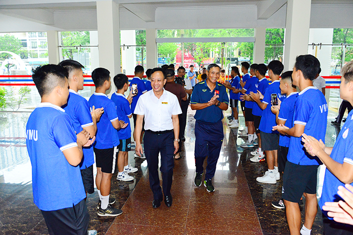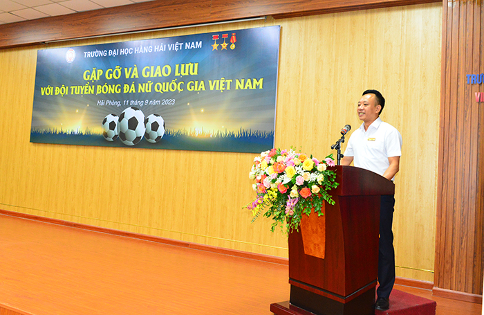 Phát biểu chào mừng Đội tuyển Nữ quốc gia Việt Nam, PGS.TS. Phạm Xuân Dương - Hiệu trưởng thay mặt toàn thể cán bộ, giảng viên, công nhân viên và học viên, sinh viên (CB, GV, CNV và HV, SV) Trường Đại học Hàng hải Việt Nam bày tỏ lòng ngưỡng mộ, niềm tự hào dân tộc đối với những cô gái được ví là những bông hồng thép, những trái tim vàng mang hào khí Việt Nam. Qua đây, Hiệu trưởng trân trọng cảm ơn Huấn luyện viên trưởng Mai Đức Chung cùng các thầy, cô trong Ban Huấn luyện của Đội tuyển bóng đá Nữ quốc gia Việt Nam và các em Nữ tuyển thủ bóng đã Nữ quốc gia Việt Nam đã đến thăm, giao lưu với Thầy và trò Nhà trường.