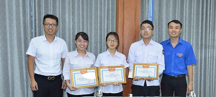Đồng chí Lê Hoàng Dương – Bí thư Đoàn Thanh niên, Chủ tịch Hội sinh viên cùng đồng chí Nguyễn Mạnh Cường – Phó Bí thư Đoàn thanh niên trao bằng khen cho các em sinh viên.