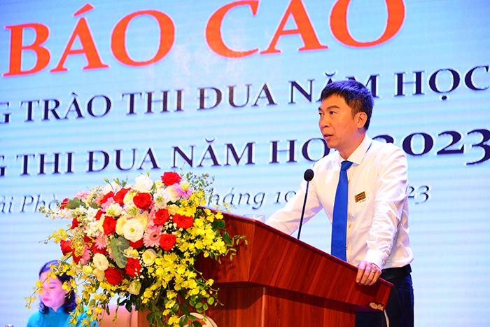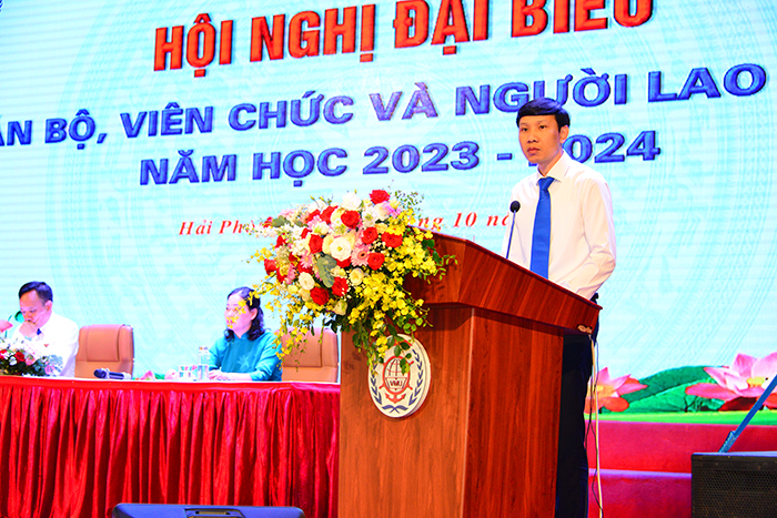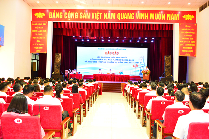 Tại Hội nghị, PGS.TS Nguyễn Công Vịnh - Ủy viên Ban Chấp hành Đảng bộ, Chủ tịch Công đoàn Trường đã Báo cáo tổng kết phong trào thi đua năm học 2022-2023; phát động thi đua năm học 2023-2024. Toàn thể CB, VC, NLĐ đã đoàn kết, chung vai sát cánh cùng tập thể lãnh đạo Nhà trường hoàn thành tốt các chỉ tiêu đề ra; trong đó nổi bật là hoàn thành việc kiểm định chất lượng cơ sở giáo dục Đại học tại Trường Đại học Hàng hải Việt Nam chu kỳ 2 theo Thông tư 12/2017/TT-BGDĐT ngày 19/5/2017 của Bộ trưởng Bộ GD-ĐT quy định về kiểm định chất lượng cơ sở giáo dục đại học và được Chính phủ trao tặng Cờ thi đua vì đã hoàn thành xuất sắc, toàn diện nhiệm vụ công tác, dẫn đầu phong trào thi đua năm 2022 của Bộ Giao thông vận tải.
