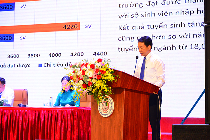 PGS.TS Nguyễn Thanh Sơn - Phó Hiệu trưởng Nhà trường báo cáo kết quả thực hiện Nghị quyết Hội nghị CB, VC, NLĐ năm học 2022-2023 và phương hướng nhiệm vụ năm học 2023-2024