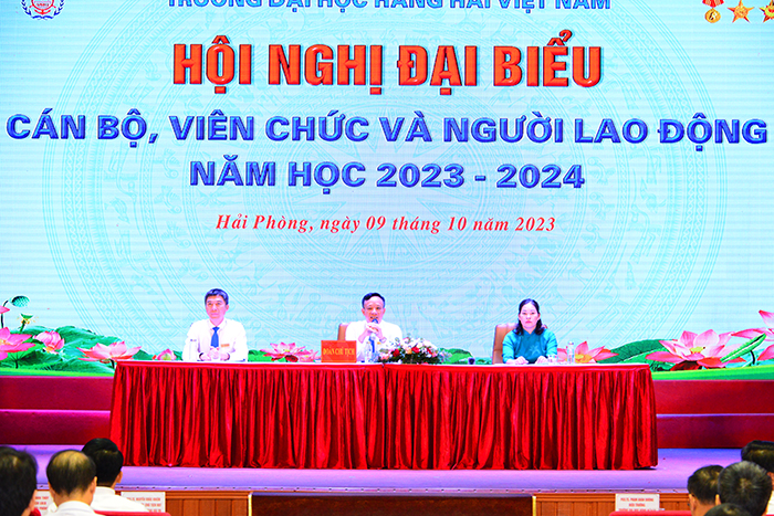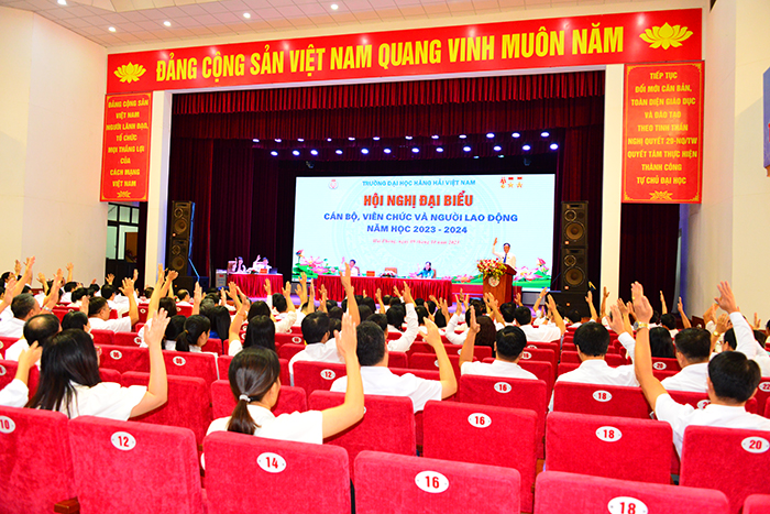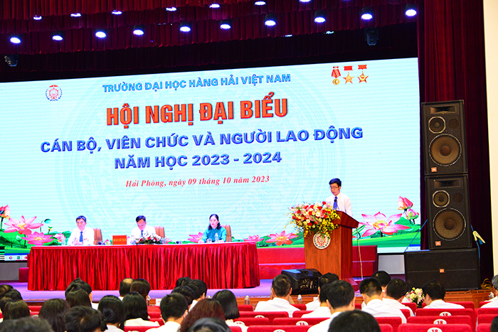 08h00 ngày 09/10/2023, tại Hội trường A8, Trường Đại học Hàng hải Việt Nam tổ chức Hội nghị đại biểu cán bộ, viên chức và người lao động (CB, VC, NLĐ) năm học 2023-2024 để đánh giá kết quả thực hiện Nghị quyết Hội nghị CB, VC, NLĐ; tổng kết phong trào thi đua năm học 2022-2023, triển khai phương hướng, nhiệm vụ năm học 2023-2024, giải đáp các kiến nghị, đề xuất của CB, VC, NLĐ.