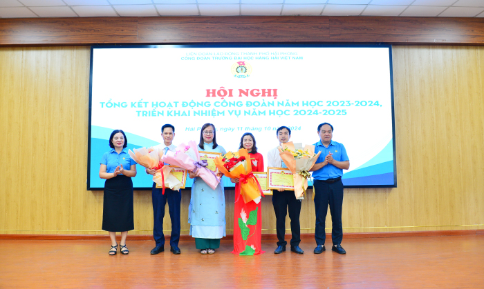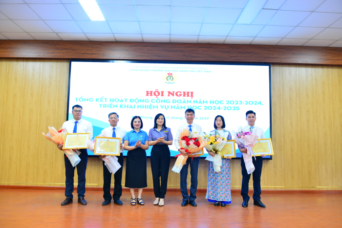 Đồng chí Lê Thị Thanh Thủy - Phó Chủ tịch LĐLĐ thành phố Hải Phòng và PGS.TS. Nguyễn Hồng Vân - Phó Bí thư Đảng ủy Nhà trường tặng Bằng khen của LĐLĐ thành phố Hải Phòng cho 06 cá nhân thuộc Trường Đại học Hàng hải Việt Nam vì đã có thành tích xuất sắc trong phong trào thi đua lao động giỏi và xây dựng tổ chức Công đoàn vững mạnh năm học 2023-2024