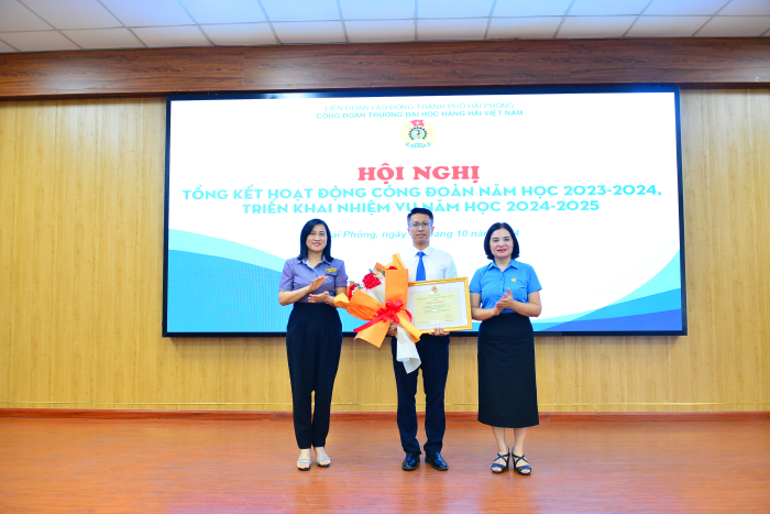 Đồng chí Lê Thị Thanh Thủy - Phó Chủ tịch LĐLĐ thành phố Hải Phòng và PGS.TS. Nguyễn Hồng Vân - Phó Bí thư Đảng ủy Nhà trường trao Bằng khen của Tổng LĐLĐ Việt Nam cho đồng chí Nguyễn Lê Mạnh Cường - Phó Chủ tịch Công đoàn Trường trong phong trào thi đua Lao động giỏi và xây dựng tổ chức Công đoàn vững mạnh năm học 2023-2024