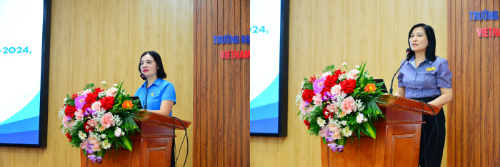Đồng chí Lê Thị Thanh Thủy - Phó Chủ tịch Liên đoàn Lao động Thành phố và PGS.TS. Nguyễn Hồng Vân - Phó Bí thư Đảng ủy Nhà trường phát biểu tại Hội nghị