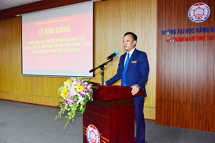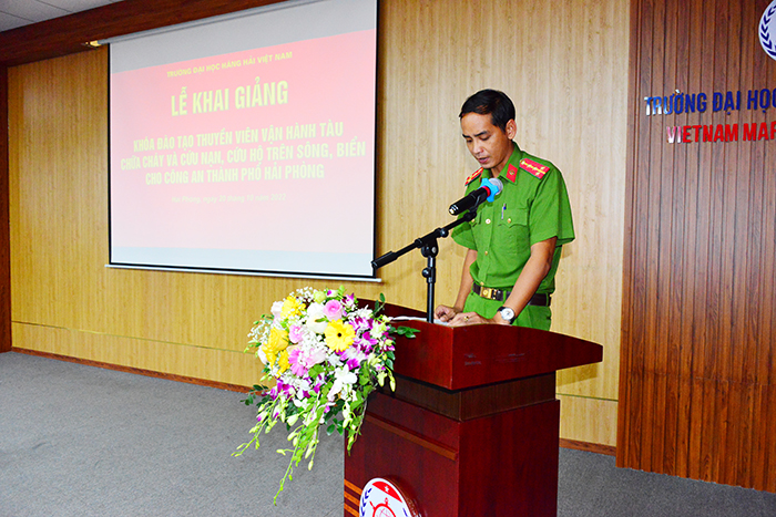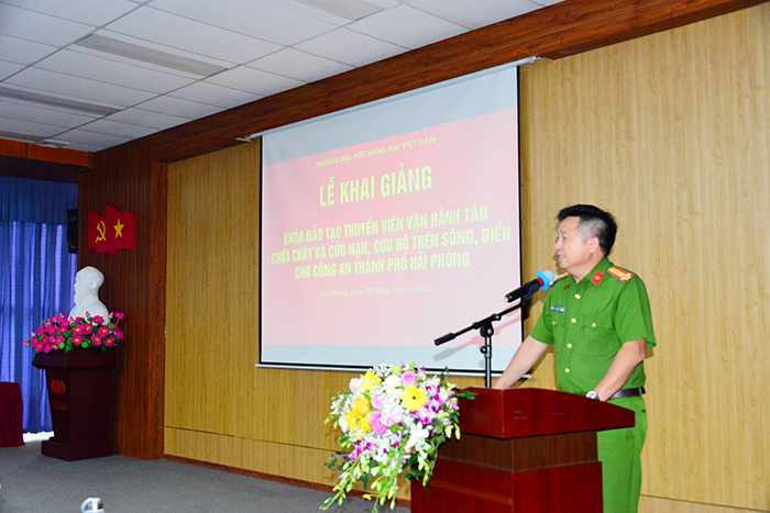 Nhằm góp phần nâng cao năng lực trong việc thực hiện nhiệm vụ phòng cháy, chữa cháy, cứu hộ, cứu nạn, tuần tra góp phần đảm bảo an ninh, trật tự, an toàn trên sông, biển của Thành phố Hải Phòng, lúc 14h00 ngày 20/10/2022 Công an TP. Hải Phòng đã phối hợp với Trường Đại học Hàng hải Việt Nam tổ chức khai giảng khoá đào tạo thuyền viên vận hành tàu chữa cháy và cứu nạn, cứu hộ trên sông, biển cho Công an thành phố Hải Phòng.