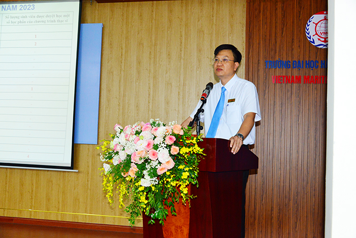 Mở đầu buổi lễ, PGS.TS Nguyễn Kim Phương - Viện trưởng Viện Đào tạo Sau đại học trình bày báo cáo tóm tắt quá trình tuyển sinh sau đại học đợt 2 năm 2022 và công bố các quyết định công nhận trúng tuyển của 142 học viên cao học. Năm 2023 là năm thứ hai Nhà trường tổ chức kỳ tuyển sinh đào tạo trình độ thạc sĩ theo Quy chế tuyển sinh và đào tạo trình độ thạc sĩ mới của Bộ Giáo dục và Đào tạo, và của Trường Đại học Hàng hải Việt Nam.