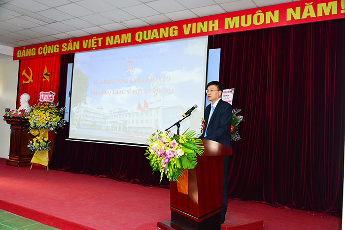 Phát biểu tại Lễ Khai giảng, PGS.TS Phạm Xuân Dương – Phó Bí thư Đảng ủy, Hiệu trưởng Nhà trường nhiệt liệt chúc mừng 183 tân học viên cao học đã xuất sắc trải qua kỳ thi tuyển đào tạo trình độ thạc sĩ đợt 2 năm 2021 của Trường Đại học Hàng hải Việt Nam – một ngôi trường có bề dầy lịch sử hơn 65 năm xây dựng, hội nhập và phát triển. Năm 2021, đánh dấu bước phát triển đột phá của Nhà trường trong đào tạo theo chuẩn quốc tế nhằm đáp ứng nguồn nhân lực phục vụ cho “Chiến lược phát triển bền vững kinh tế biển Việt Nam đến 2030 tầm nhìn 2045” và chủ động hội nhập toàn cầu. Nhà trường đã chủ động ban hành các chiến lược phát triển quan trọng đến 2025 và tầm nhìn đến 2030, bao gồm: Chiến lược phát triển giáo dục và đào tạo, Chiến lược phát triển Khoa học công nghệ, Chiến lược phát triển Hợp tác quốc tế,…