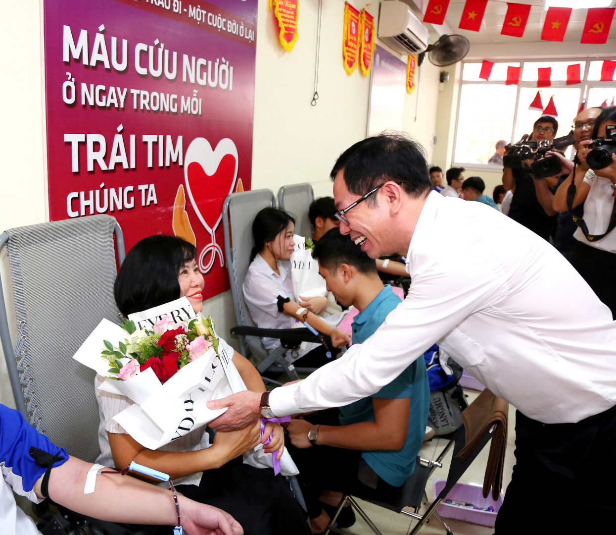 Đồng chí Vũ Tiến Phụng - Ủy viên Ban Thường vụ Thành ủy, Phó Chủ tịch Ủy ban nhân dân thành phố Hải Phòng tặng hoa cho các tình nguyện viên tham gia Ngày toàn dân hiến máu tình nguyện năm 2026