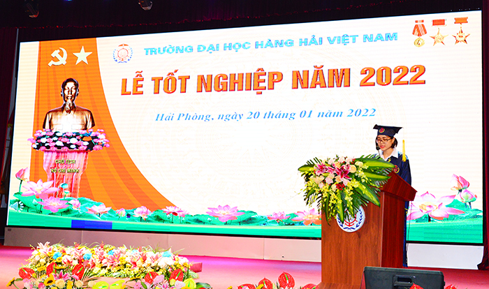 Trong niềm vui ngày tốt nghiệp, tân cử nhân Lê Phương Thảo sinh viên lớp KTN58CL, Viện Đào tạo chất lượng cao đại diện cho các tân cử nhân, kỹ sư phát biểu, bày tỏ lòng biết ơn sâu sắc tới Ban lãnh đạo Nhà trường, các thầy/cô giáo vì đã luôn đồng hành cùng sinh viên trong suốt những năm qua không chỉ trong học tập mà còn qua các phong trào đầy bổ ích; đồng thời gửi lời cảm ơn các thế hệ thầy trò Nhà trường đã gây dựng lên Trường Đại học Hàng hải Việt Nam vững mạnh, trở thành niềm tin và ước vọng của bao thế hệ sinh viên sau này. “Hơn 4 năm qua chỉ là sự khởi đầu cho quãng đường rất dài phía trước, vì vậy hãy lấy thành công của ngày hôm nay là bước đà vững mạnh cho sự phát triển bền vững trên con đường tương lai”