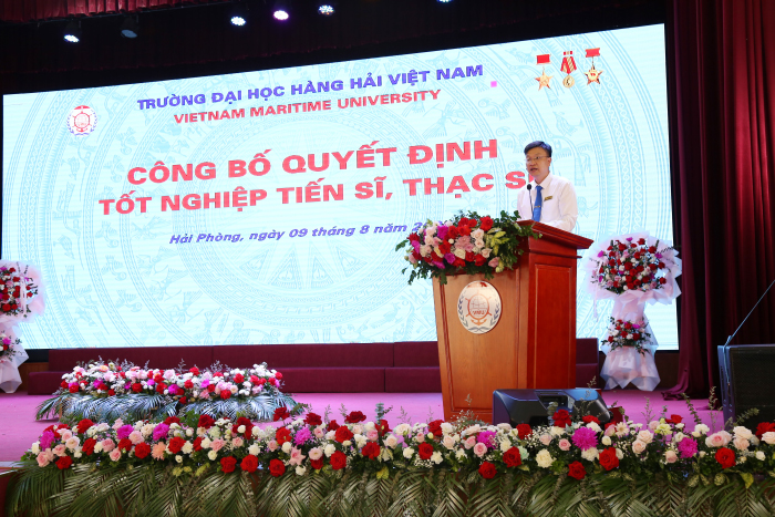 Nhân dịp này, thầy Hiệu trưởng cũng gửi lời tri ân sâu sắc tới đội ngũ cán bộ, giảng viên, các nhà khoa học đã tận tâm đồng hành, hướng dẫn và hỗ trợ học viên trong suốt quá trình học tập, nghiên cứu; cảm ơn các cơ quan, doanh nghiệp đã hợp tác chặt chẽ với Nhà trường; và đặc biệt, cảm ơn gia đình các tân tiến sĩ, tân thạc sĩ đã tin tưởng lựa chọn Trường Đại học Hàng hải Việt Nam là nơi bồi đắp tri thức. Thầy Hiệu trưởng khẳng định, ở bất kỳ cương vị nào, Nhà trường luôn sẵn sàng chào đón các cựu học viên trở lại với Mái trường Đại dương thân yêu - ngôi nhà thứ hai của mỗi người. Chính sự nhiệt huyết, đam mê và sáng tạo của các thế hệ học viên đã góp phần làm nên giá trị cốt lõi của Nhà trường: “Trí tuệ - Sáng tạo - Trách nhiệm - Nhân văn”.