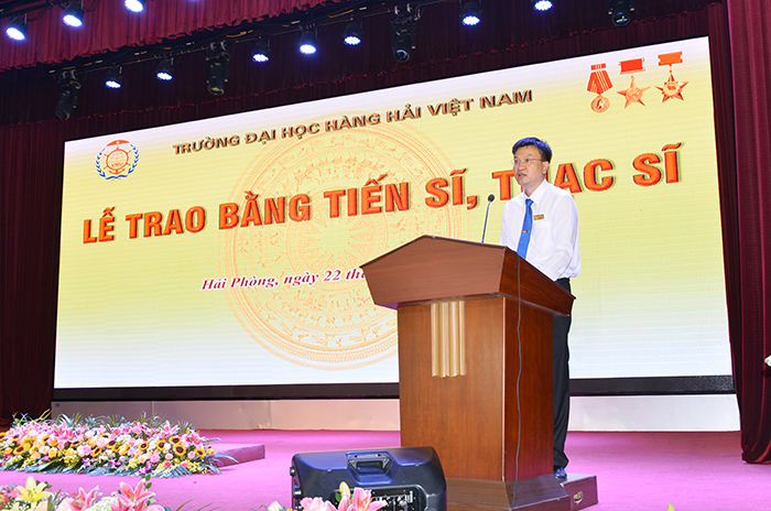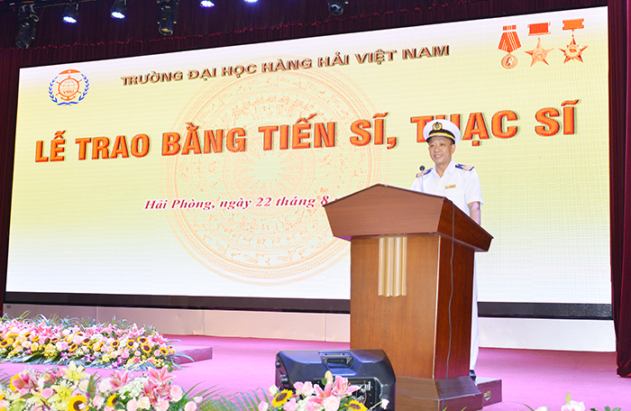 Phát biểu tại buổi lễ, PGS.TS. Phạm Xuân Dương - Hiệu trưởng Nhà trường chúc mừng và biểu dương thành tích học tập của các học viên đồng thời khẳng định Trường Đại học Hàng hải Việt Nam tiếp tục thực hiện Chiến lược phát triển bền vững kinh tế biển Việt Nam đến năm 2030, tầm nhìn đến năm 2045, định hướng phát triển của Nhà trường trong thời gian tới: “Là trung tâm đào tạo nguồn nhân lực trình độ cao, nghiên cứu khoa học và chuyển giao công nghệ của đất nước và khu vực nhằm thực hiện thành công chiến lược phát triển kinh tế biển của Tổ quốc”.