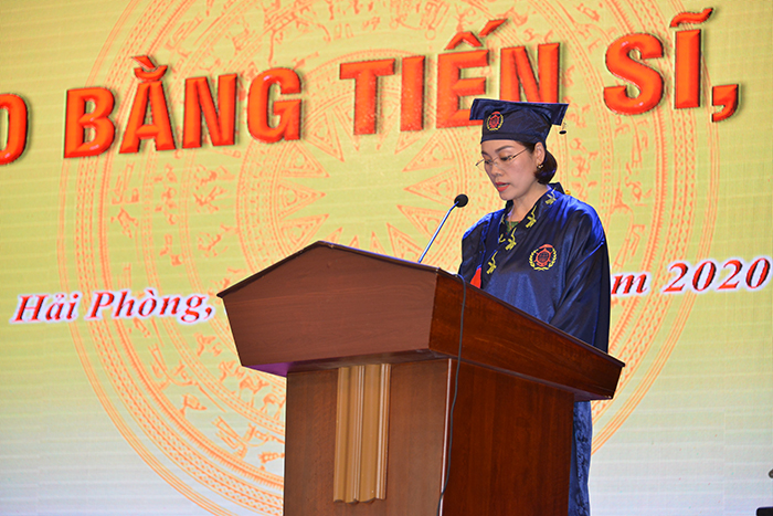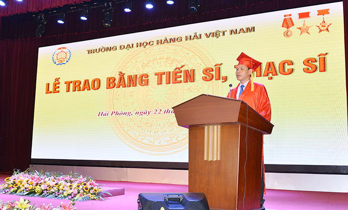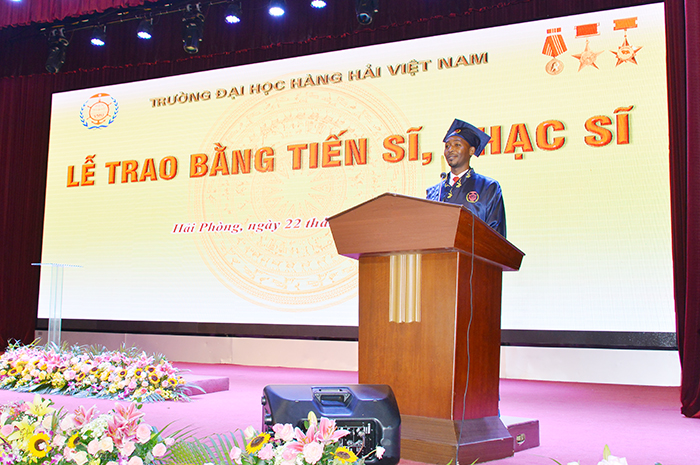 Đại diện cho các tân tiến sĩ, thạc sĩ phát biểu, bày tỏ niềm vui, niềm tự hào khi được học tập và nghiên cứu dưới Mái trường Đại dương, hứa sẽ đem hết tâm lực, trí lực và kiến thức đã được đúc kết qua quá trình học tập, nghiên cứu từ Nhà trường, vận dụng một cách linh hoạt và sáng tạo vào thực tiễn để chứng minh và khẳng định với xã hội rằng: “Sản phẩm nguồn nhân lực mà Trường Đại học Hàng Hải Việt Nam cung cấp cho xã hội là sản phẩm có Chất lượng tốt - Tốt về nhân cách - Tốt về tư duy kiến thức chuyên ngành - Tốt về kỹ năng làm việc và đạo đức nghề nghiệp” và chúng em nghĩ rằng đó cũng là một cách để tri ân với Nhà trường và các thầy cô giáo.”