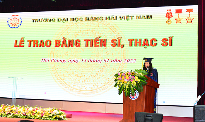 Đại diện cho các tân tiến sĩ, thạc sĩ, tân thạc sĩ Hoàng Thị Khánh Huyền - lớp QLKT 2019.2.1 phát biểu, bày tỏ niềm vui, niềm tự hào khi được học tập và nghiên cứu dưới Mái trường Đại dương, hứa sẽ đem hết tâm lực, trí lực và kiến thức đã được đúc kết qua quá trình học tập, nghiên cứu từ Nhà trường, vận dụng một cách linh hoạt và sáng tạo vào thực tiễn. Đây cũng là cách để tri ân tới các thầy cô và Nhà trường.