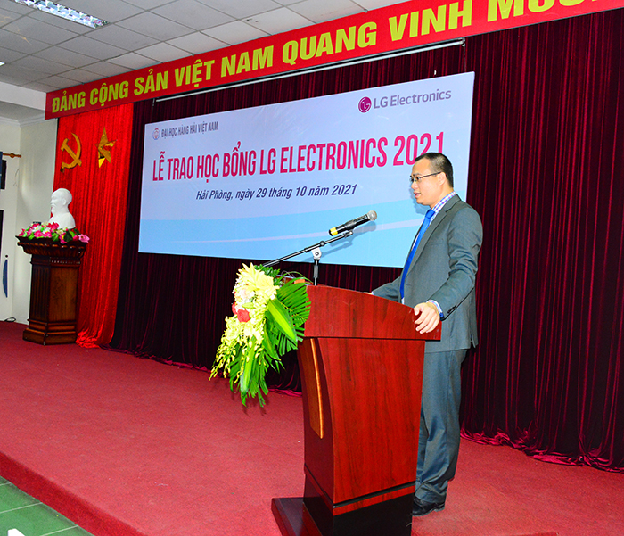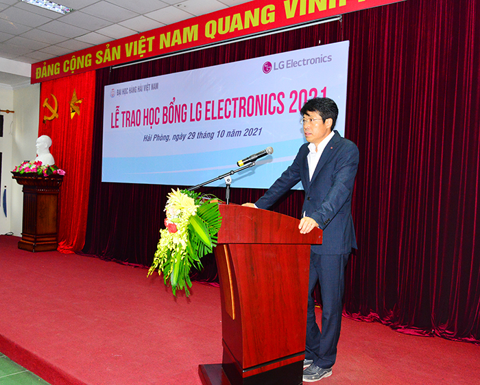 Ông Kwon Gi Jun – Giám đốc khối hỗ trợ doanh nghiệp Công ty TNHH LG Electronics Việt Nam Hải Phòng bày tỏ niềm phấn khởi khi lần thứ hai đến thăm Trường Đại học Hàng hải Việt Nam và cảm ơn sự đón tiếp nồng ấm của Nhà trường. Ông cũng nhấn mạnh Công ty LG là một công ty có vốn đầu tư nước ngoài lớn và Công ty TNHH LG Electronics Việt Nam Hải Phòng là một trong những chi nhánh có quy mô lớn nhất tại Việt Nam. Ông Kwon Gi Jun mong muốn phát triển hơn nữa mối quan hệ hợp tác với Trường Đại học Hàng hải Việt Nam trong đào tạo nguồn nhân lực chất lượng cho Công ty LG trong thời gian tới. Với những sinh viên được nhận học bổng, ông Kwon Gi Jun mong muốn phần thưởng này sẽ là động lực giúp các em phấn đấu học tập tốt, trở thành những sinh viên giỏi về chuyên môn và kỹ năng công nghệ. Đặc biệt Ông cũng nhấn mạnh ngoài Tiếng Anh, các sinh viên nên trau dồi thêm tiếng Hàn bởi đó sẽ là một lợi thế khi các bạn đi xin việc ở Công ty LG. Ông hy vọng các bạn sinh viên sẽ lựa chọn Công ty LG là nơi công tác, cùng tham gia cống hiến đóng góp cho sự phát triển của ngôi nhà chung này.