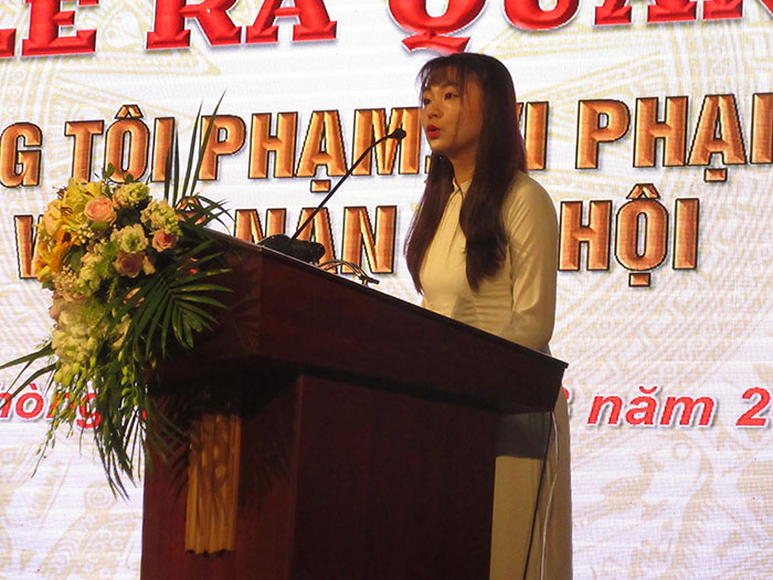 Tại buổi lễ, sinh viên Nguyễn Yến Linh, Trường Đại học Hàng Hải Việt Nam đã đại diện học sinh, sinh viên phát biểu cam kết sẽ tích cực tham gia đấu tranh phòng, chống tội phạm, vi phạm pháp luật và tệ nạn xã hội trong môi trường học đường. “Thay mặt cho các bạn học sinh, sinh viên tôi xin hứa sẽ thực hiện tốt các quy định trong công tác phòng chống tội phạm, tệ nạn xã hội và vi phạm pháp luật, cùng nhau xây dựng môi trường học đường an toàn, lành mạnh, không tệ nạn.”
