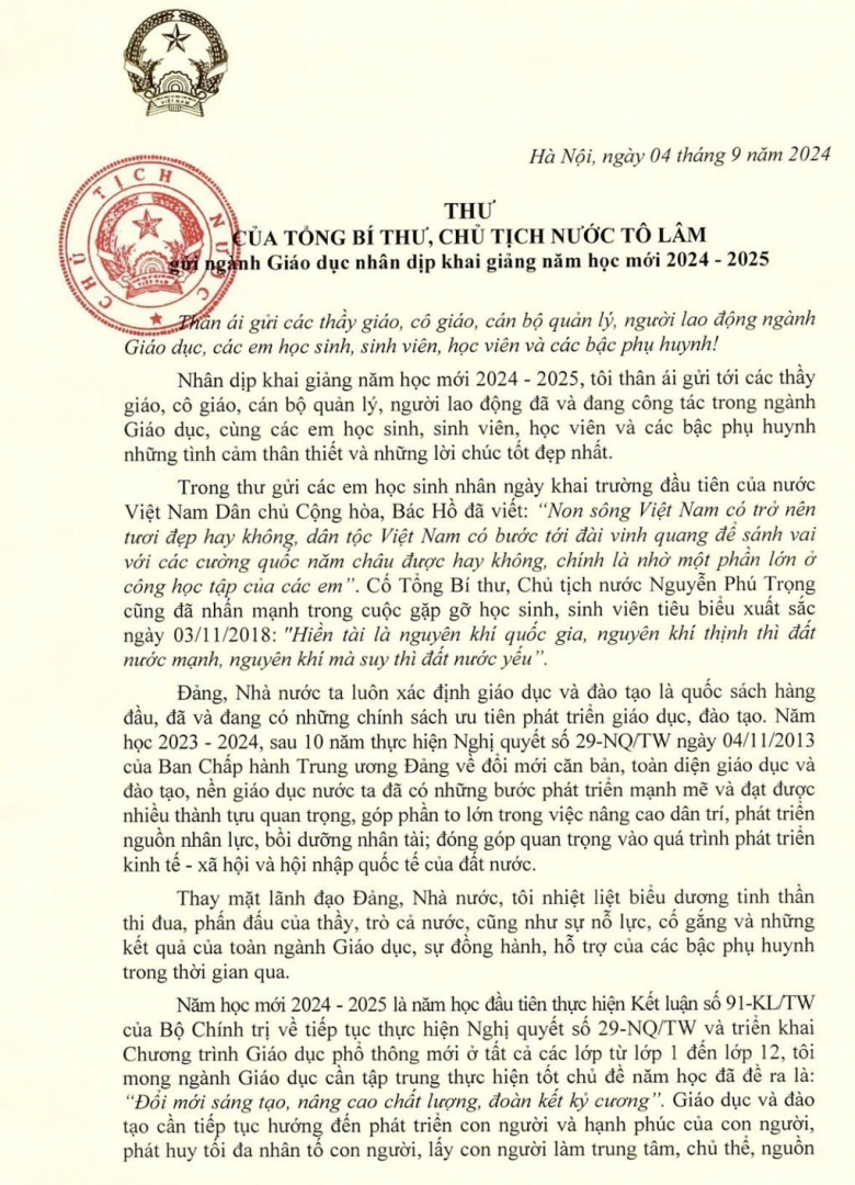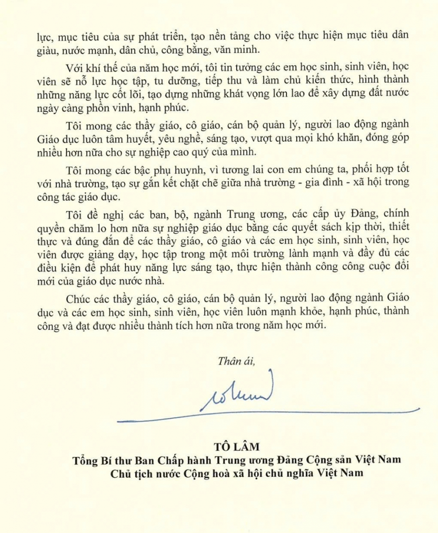 Tổng Bí thư, Chủ tịch nước gửi thư chúc mừng năm học mới 2025