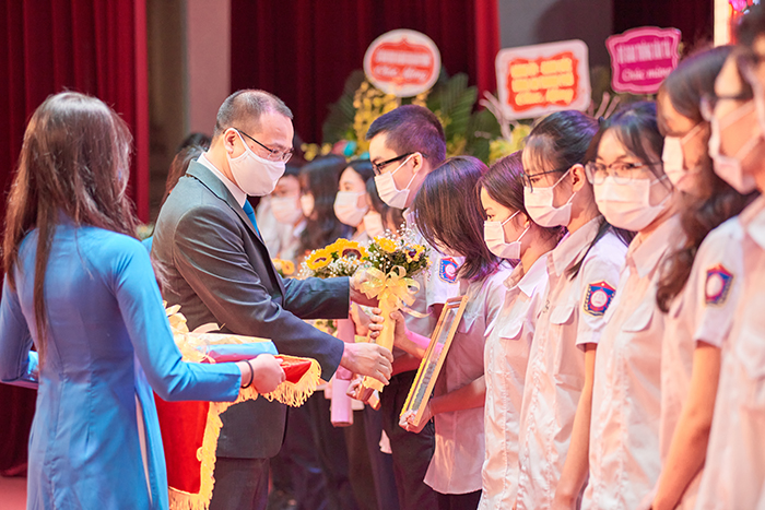 PGS.TS Nguyễn Minh Đức – UV Ban Thường vụ, Phó Hiệu trưởng Nhà trường trao Quyết định khen thưởng cho 16 tân sinh viên có điểm xét tuyển cao trong kỳ thi tuyển sinh năm học 2021-2022 trong đó có 1 em sinh viên là thủ khoa.