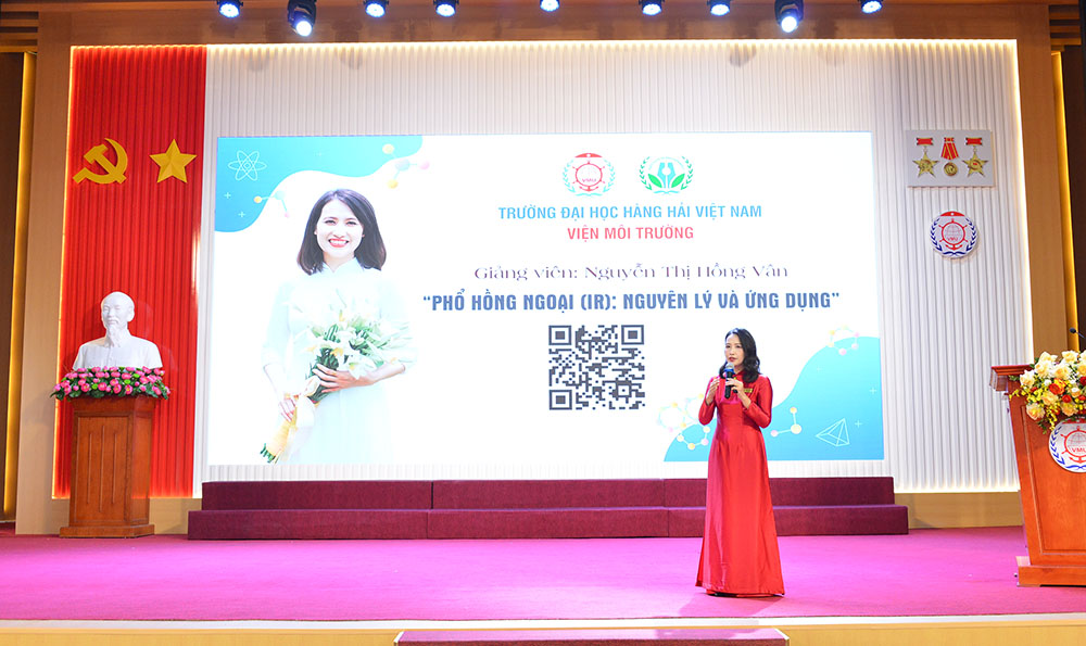 Giảng viên Nguyễn Thị Hồng Vân đến từ Viện Môi trường trình bày phần dự thi và trả lời câu hỏi từ Hội đồng chấm thi